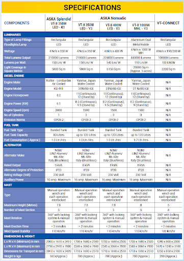 Aska Mobile light towers comprises of three main components i.e Power Source (Engine with alternator or Battery bank ), Mast with LED lights and controller having unmatched advanced technological features including ease of portability providing most economical and qualitative advantages to the users. In addition, It has high lumens covering wide viewing range including longer depth & more coverage area with sufficient intensity of light. Further, It takes full care of the safety of the complete Lighting tower including components as well as workforce deployed thereby. It is next generation exemplary product with remarkable life cycle, sustainability and green energy meeting prescribed emission norms by Ministry of Environment